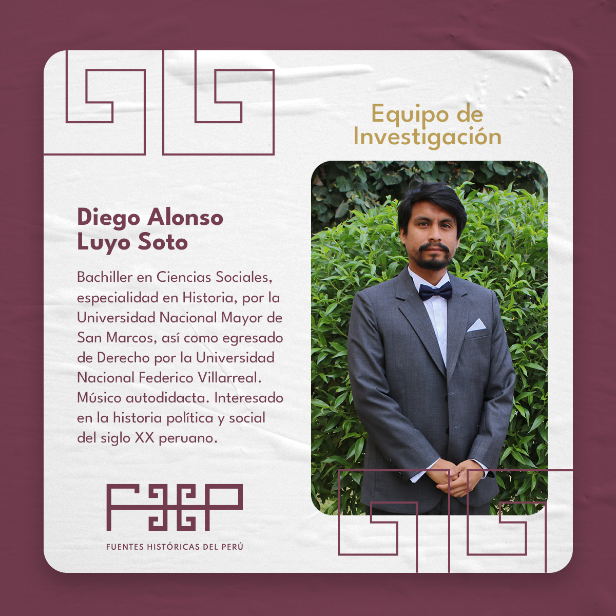 Bachiller en Historia por la Universidad Nacional Mayor de San Marcos. Egresado de Derecho por la Universidad Nacional Federico Villarreal. Músico autodidacta. Actualmente está investigando sobre anticomunismos en Perú y el escenario político y cultural del Cusco de finales del siglo XX. Líneas de investigación: Historia política y social del XX, apristología, arte y visualidad.