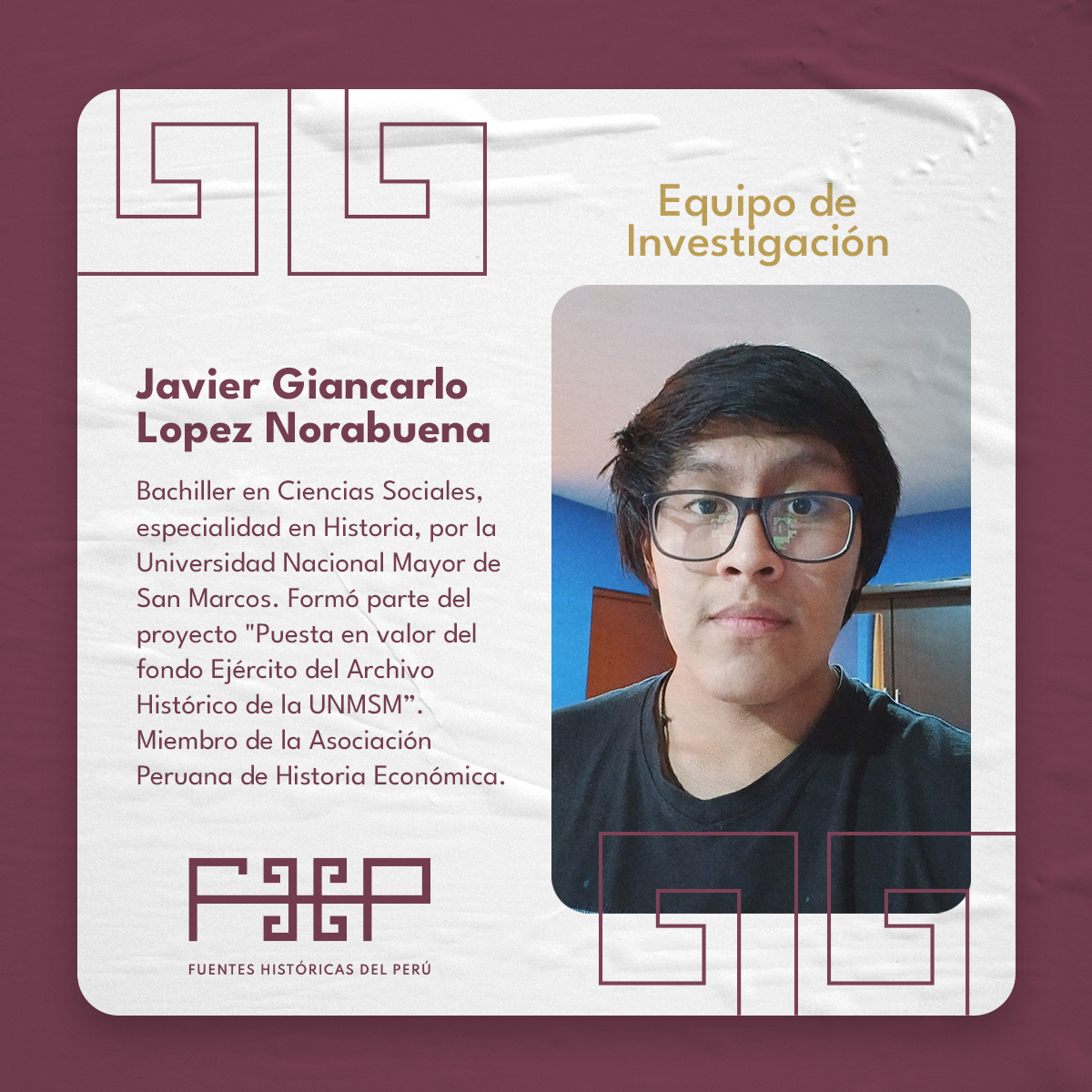Estudiante del posgrado en Historia en la Universidad de California, Davis. Es bachiller en Ciencias Sociales, especialidad Historia, por la Universidad Nacional Mayor de San Marcos. Ha cursado el Diplomado en Historia de América por la Universidad Nacional Autónoma de México. Ha co-editado el libro Hijos de inmigrantes (2019) con Manuel Burga Díaz. Ha formado parte del proyecto de digitalización del archivo de la Confederación Campesina del Perú con el apoyo del Modern Endangered Archives Program (Universidad de California, Los Ángeles). Ha colaborado en proyectos de investigación en la Pontificia Universidad Católica de Chile, Sociedad Polaca de Estudios Latinoamericanos, Universidad Científica del Sur, entre otros. Fue miembro becario de la Red de Humanidades Digitales (2024-2025) y ha sido beneficiado con el Summer Fellowship 2025 del Hemispheric Institute on the Americas (Universidad de California, Davis). Líneas de investigación: Actualmente se encuentra realizando su investigación doctoral sobre las estrategias colectivas de alimentación entre los años setentas y ochentas. Entre sus temas de interés se encuentra la producción y comercio de carne en Lima a inicios del siglo XX, las reflexiones en torno a la investigación histórica y ciencias sociales, así como los retos y desafíos de la era digital. Su actividad profesional lo ha llevado a explorar diversos temas de la historia del siglo XX peruano.