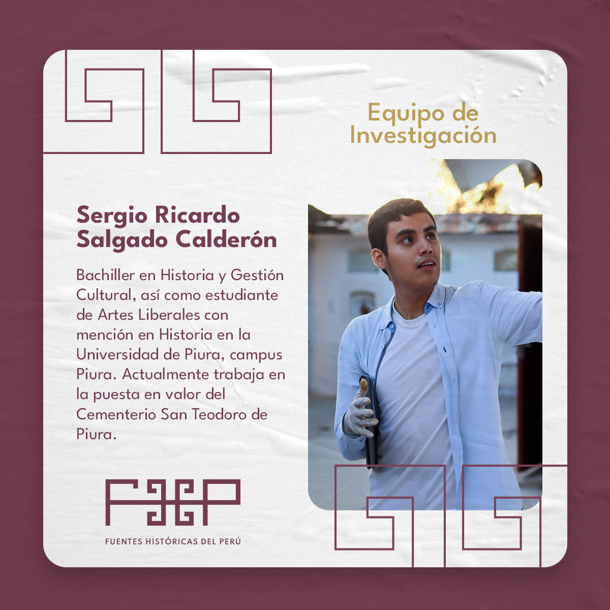 Bachiller en Historia y Gestión Cultural y estudiante de Artes Liberales con mención en Historia en la Universidad de Piura, campus Piura. Formó parte del programa de intercambio estudiantil de la UDEP en el 2023-I, realizando un semestre académico en las facultades de Conservación-Restauración de Bienes Culturales y Geografía e Historia de la Universidad de Sevilla. Durante el intercambio realizó voluntariado en la Asociación Local para la defensa del Patrimonio «La Base Natural y Cultural de Rota», donde hasta la actualidad forma parte del equipo organizador de las Jornadas anuales de Patrimonio y Derechos Humanos (2025 fue la IV edición), contando con la participación de especialistas miembros del Grupo Español de Conservación del International Institut for Conservation of Historic and Artistic Works. Asimismo, realizó investigación documental en el Archivo General de Indias sobre corrupción y venalidad en los funcionarios del partido de Piura. Actualmente trabaja en la puesta en valor del Cementerio San Teodoro de Piura, camposanto declarado Patrimonio Cultural de la Nación en el año 2000, administrado por la Sociedad de Beneficencia de Piura. Líneas de investigación: Historia de la corrupción, historia funeraria, historia urbana, monumentos y lugares de memoria, mediación cultural, historia de las mentalidades, historia económica, genealogía, historia regional, numismática, siglos XVIII, XIX y XX.