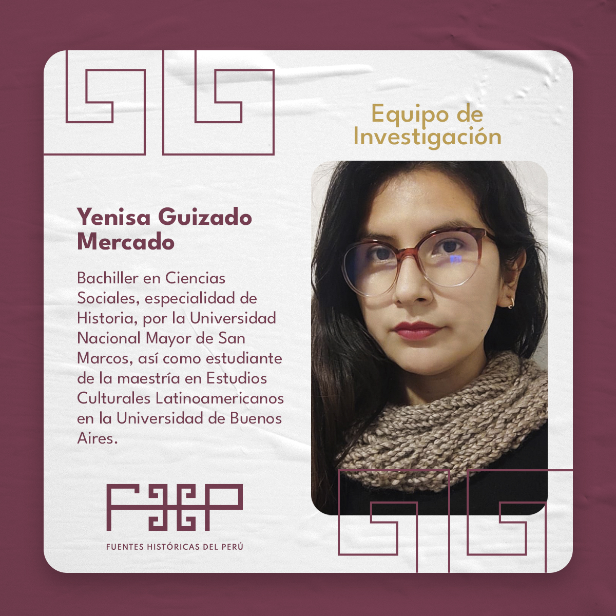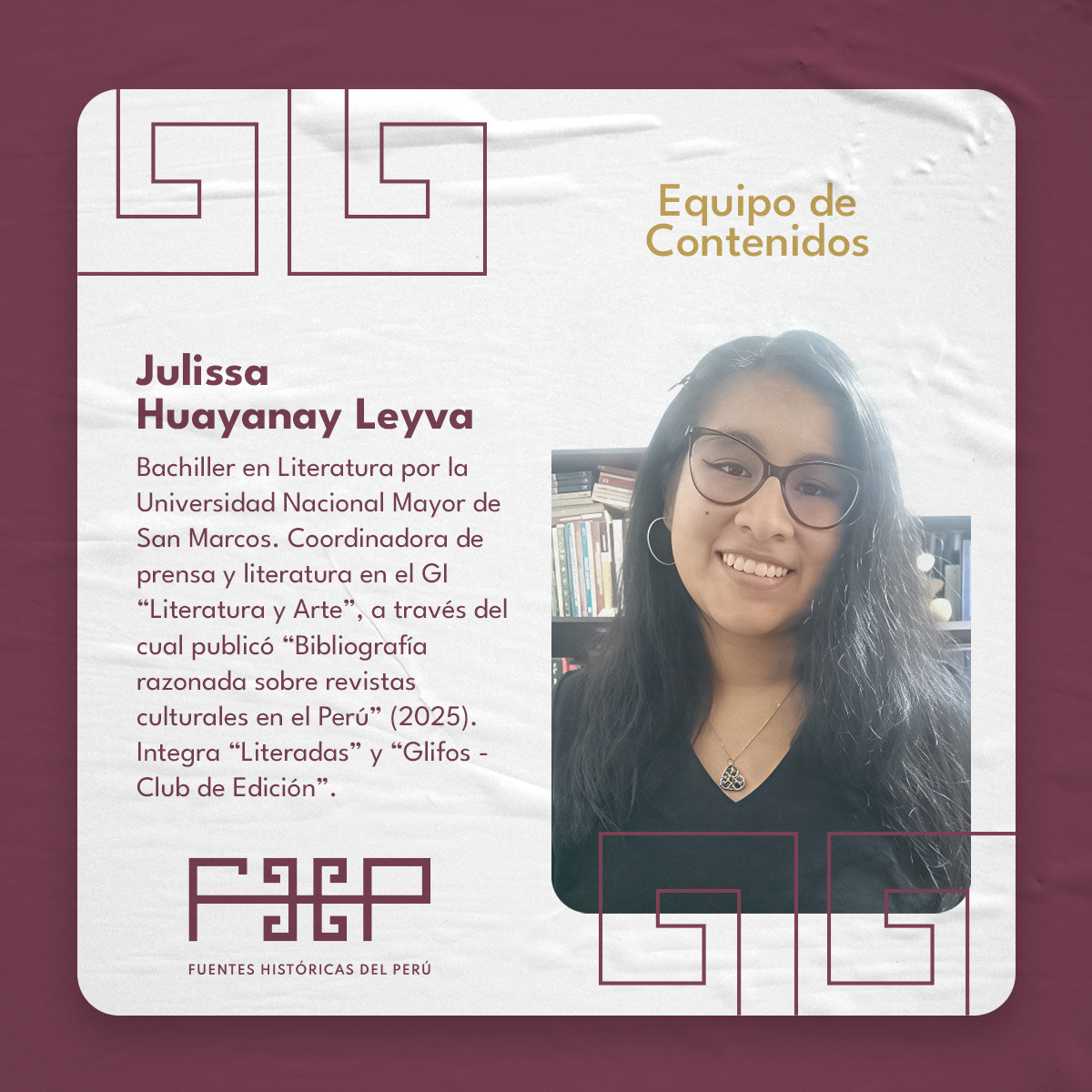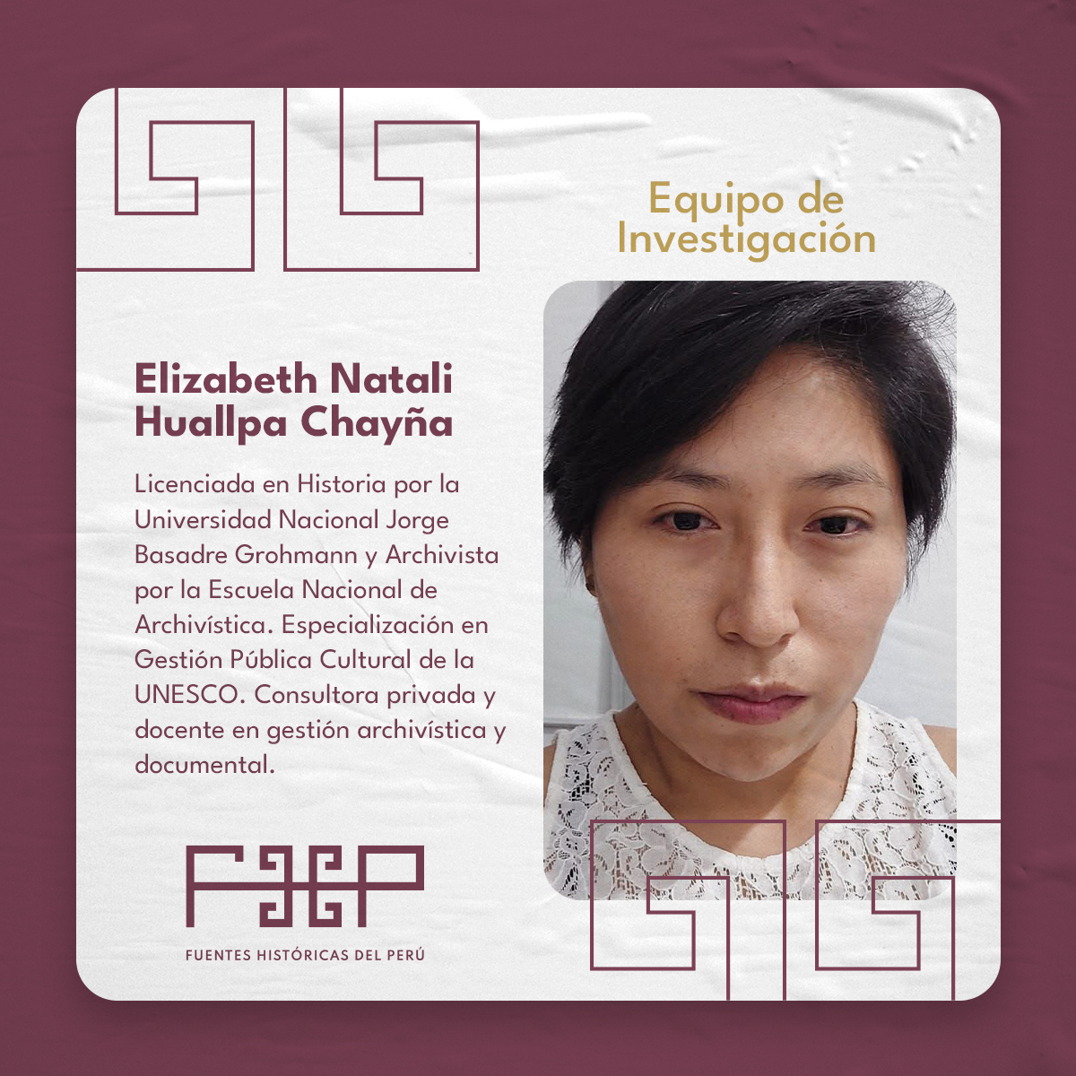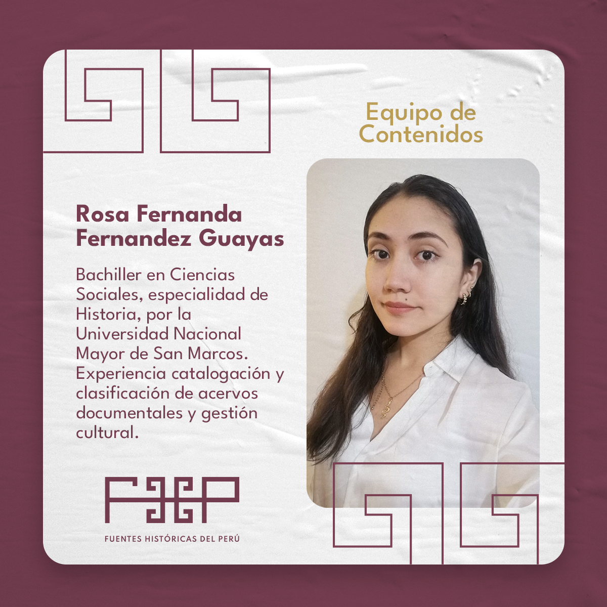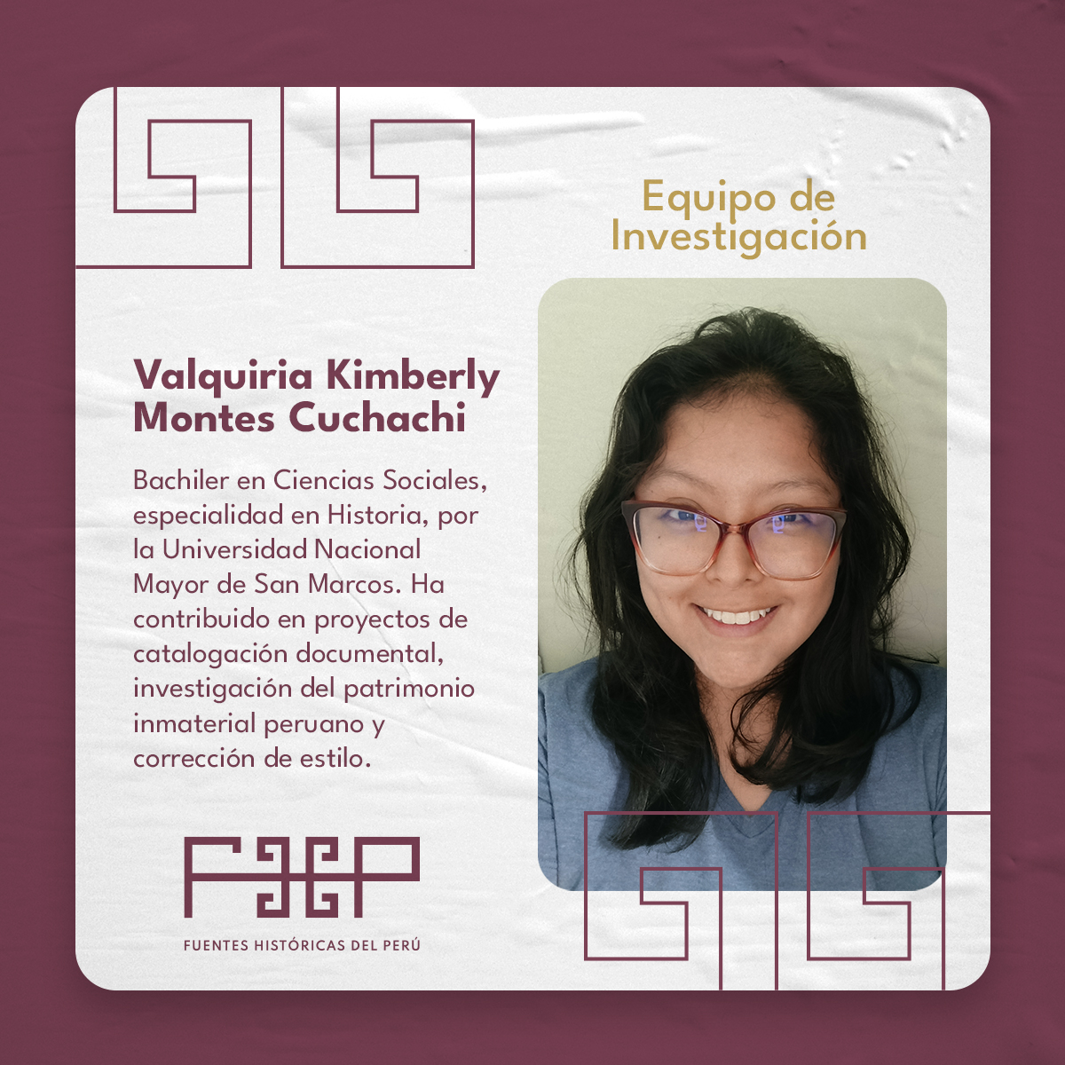 Candidata a maestrante en Gestión del Patrimonio Cultural en la Universidad Nacional Mayor de San Marcos. Es historiadora por la Universidad Nacional de Trujillo. Se ha desempeñado en espacios de gestión documental arqueológico e histórico como en la Dirección de Investigaciones del Complejo Arqueológico El Brujo, la U.E. 007: Marcahuamachuco, Proyecto Especial Bicentenario, Archivo General de la Nación y en la Biblioteca Nacional del Perú. Fue becaria de los programas “Gestión y conservación del patrimonio documental archivístico y bibliográfico” financiado por el proyecto Erasmus + y CODICIS, también del Diplomado “Historia de América” realizado por la Universidad Nacional Autónoma de México y el Centro de Investigaciones sobre América Latina y el Caribe. Participó en las investigaciones de rescates literarios como “Historias, reminiscencias y cuentos” de María Negrón Ugarte y “La fundación de Trujillo” de Raúl Porras Barrenechea publicadas por la editorial Reino de Almagro. Así mismo, tiene artículos sobre las celebraciones del Centenario de la Independencia de Trujillo, la historia del cementerio Miraflores de Trujillo, espacios de entierros en Guadalupe y Huanchaco durante la colonia temprana. También lideró el equipo ganador de los Estímulos Económicos para la Cultura 2021 con el Proyecto “Mapa Literario de Trujillo” y formó parte del proyecto “Archivo Digital de la Prensa Peruana” ganador también de los estímulos económicos 2022. Actualmente es encargada del equipo de contenidos digitales en “Fuentes Históricas del Perú”. Líneas de investigación: Historia regional de La Libertad, intelectualidad y cultura impresa en el norte peruano, historia de la muerte y las mentalidades, arqueología histórica, gestión documental, conservación y digitalización, mediación y gestión cultural.