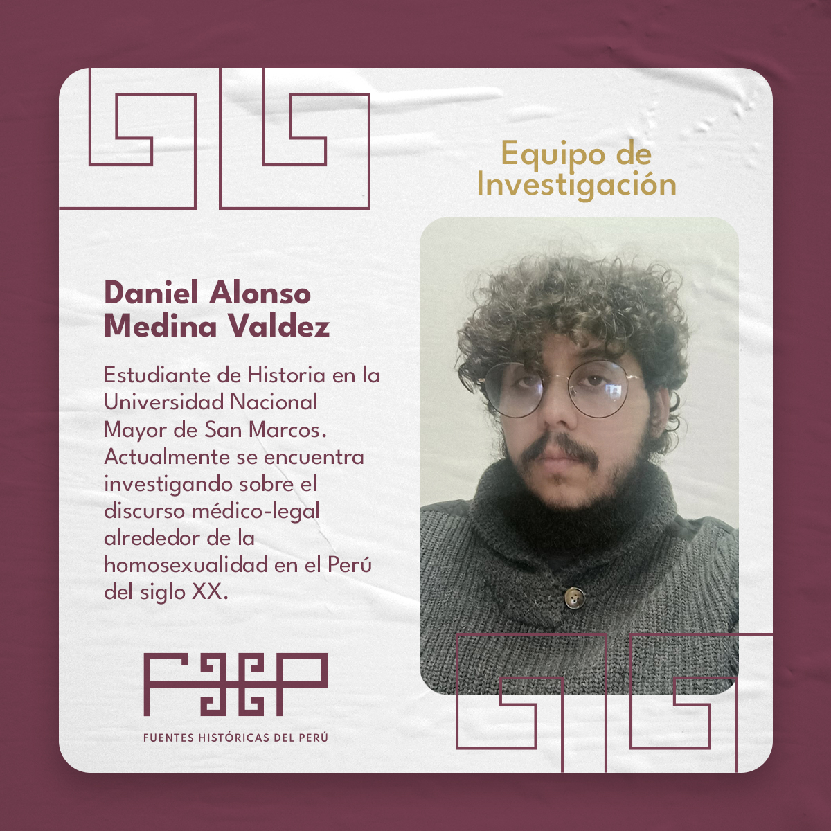 Estudiante del 5to año de la carrera de Historia en la Universidad Nacional Mayor de San Marcos. Ha desarrollado voluntariados en el Proyecto de responsabilidad social – proyección social entre la Facultad de ciencias sociales y el Lugar de la memoria, la tolerancia y la inclusión social y en el Archivo Manuel Maticorena. Actualmente se encuentra realizando la tesis de licenciatura sobre el discurso medico-psiquiatrico y criminologico sobre la homosexualidad en el Perú durante la primera mitad del S.XX y cursando el diplomando de Historia de America Latina en la Universidad Nacional Autónoma de México. Líneas de investigación: Historia de la sexualidad, historia de la medicina mental e historia social. Interés por investigaciones relacionadas a los discursos de modernidad y los procesos de modernizacion en el Perú durante la primera mitad del siglo XX.