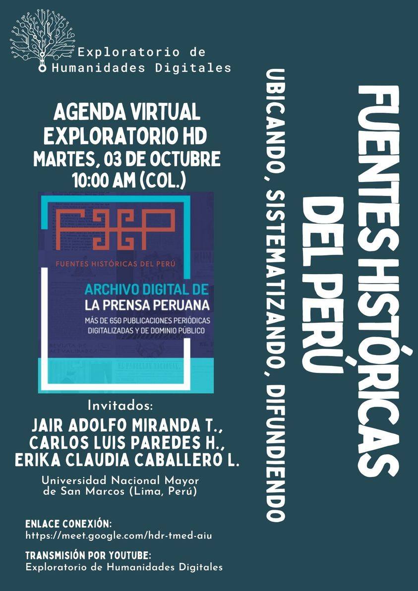 3 de octubre. Fuentes Históricas del Perú: Ubicando, sistematizando, difundiendo. Organizado por Exploratorio de Humanidades Digitales de la Universidad de Antioquía (Colombia).