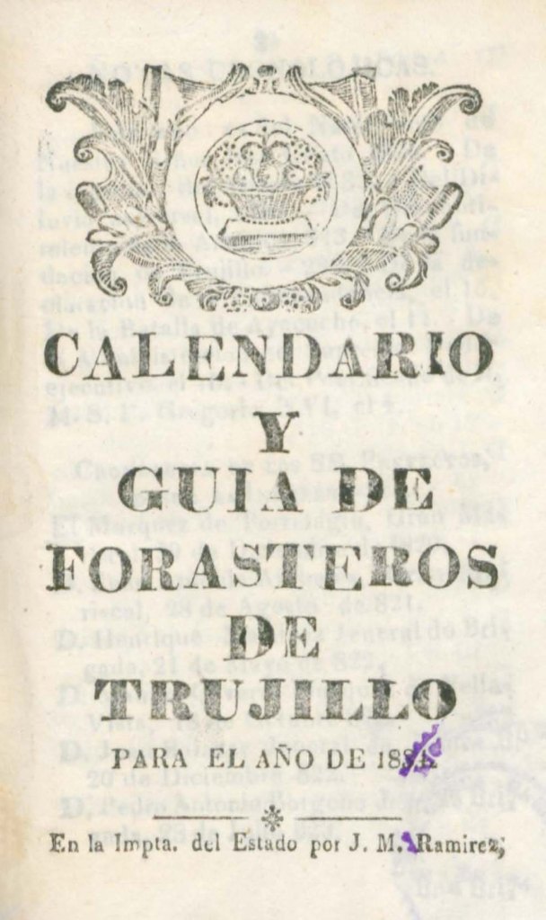 - Anónimo (1834). Calendario y guía de forasteros de Trujillo para el año 1834. Trujillo: Imprenta del Estado.