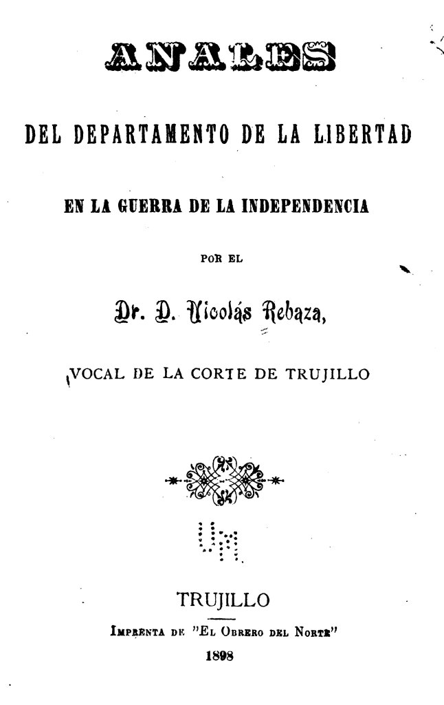 - Rebaza Cueto, Nicolás (1898). Anales del Departamento de La Libertad en la Guerra de la Independencia. Trujillo: Imprenta Obrero del Norte.