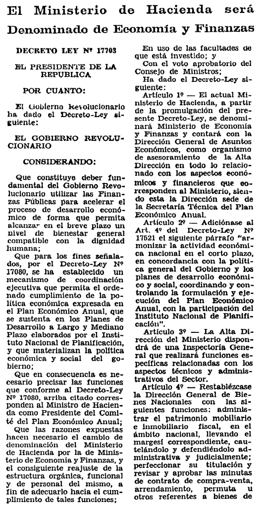 El 1 de abril de 1969 entró en vigencia el Decreto Ley nro. 17271 del 3 de diciembre de 1968, dictado por el gobierno de Juan Velasco Alvarado, el cual mandó a reordenar los ministerios del Estado. Con ello, el Ministerio de Hacienda y Comercio pasó a denominarse Ministerio de Hacienda. Luego, por Decreto Ley nro. 17703 del 13 de junio de 1969, pasó a denominarse Ministerio de Economía y Finanzas, además de ordenar el reajuste de la estructura orgánica, funcional y de personal del mismo. Con ello, el Ministerio de Hacienda llegaba a su fin.