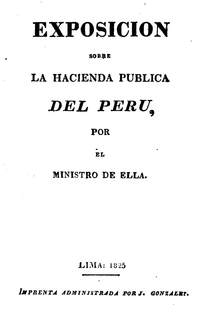 Unanue, Hipólito (1825). Exposición sobre la hacienda pública del Perú, por el ministro de ella. Lima: Imprenta administrada por J. Gonzáles.