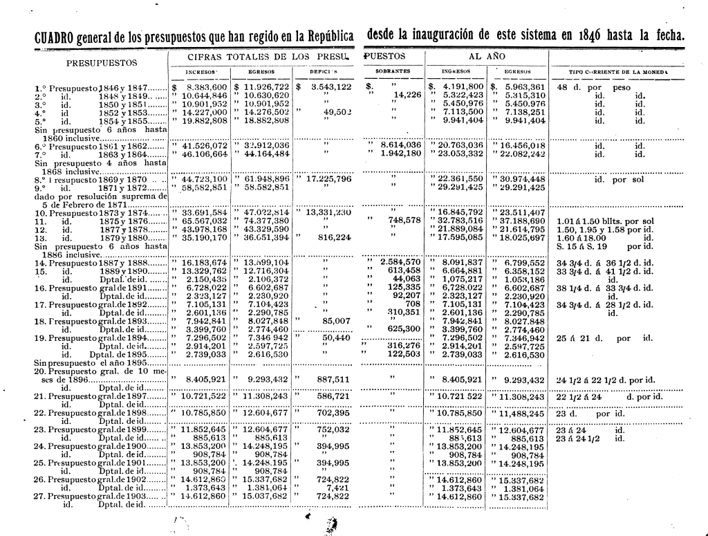 Durante el primer gobierno de Ramón Castilla la hacienda pública atravesó por una importante reorganización, adaptándose al régimen del presupuesto, el cual era un cálculo realizado por el Estado para determinar los ingresos y egresos de un periodo determinado. El 21 de octubre de 1845 el ministro de Hacienda Manuel del Río presentó a la Cámara de Diputados del Congreso el Primer Presupuesto del Perú, correspondiente al bienio de 1846-1847; sin embargo, no logró ser aprobado, aunque el Gobierno la puso en vigencia, no obstante reconoció que tenía defectos e inexactitudes (Basadre, 1983, t. III, p. 15). Hasta el año 1887, los presupuestos se votaban por bienios, siendo desde el presupuesto para 1891 hasta nuestros días de régimen anual (Dancuart, 1903, t. IV, p. 5).