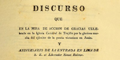 «Discurso que en la misa de acción de gracias celebrada en la Iglesia Catedral de Trujillo por la gloriosa marcha del ejército de la patria victorioso en Junín y [el] aniversario de la entrada en Lima de S.E. el Libertador Simón Bolívar […]» por Carlos Pedemonte (Trujillo, 1824)